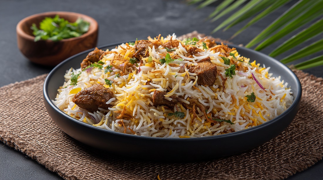 Perfect balance of spices, fluffy rice, and juicy mutton pieces.